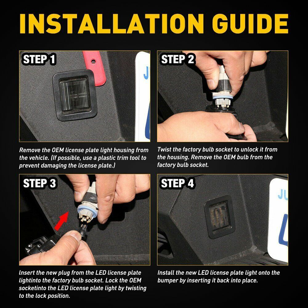 - Easy to Install - No polarity, don't worry about positive and negative connections. Plug and play, no tools required. Only takes a few minutes to direct replacement for OEM number plate lights. Looked almost identical to the original factory lens.