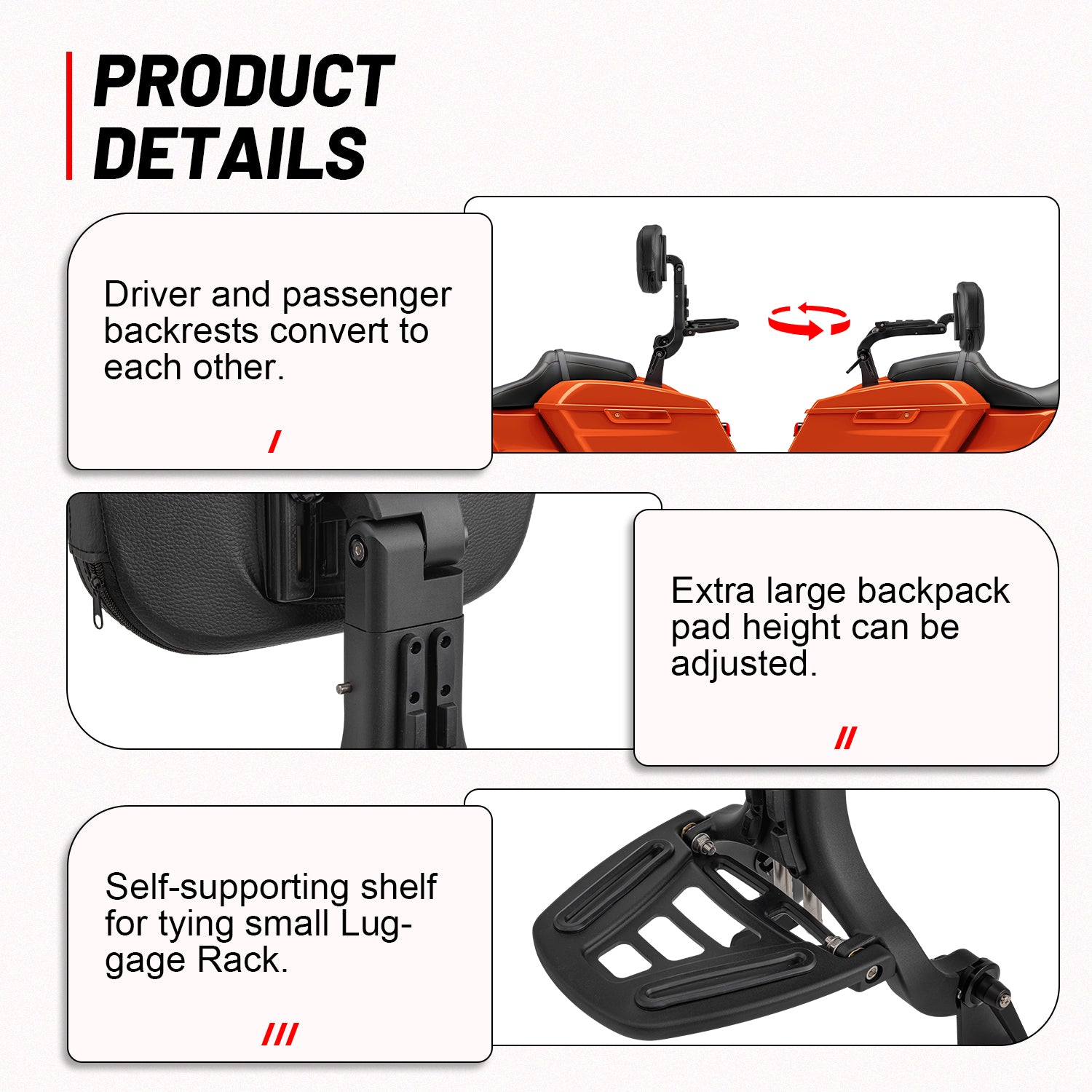 With the ergonomic height adjustment, you can find the most suitable angle according to your riding habits and posture. Our backrest for Touring Models is also equipped with a self-contained luggage rack, which is more convenient for riding long distances or daily commutes when needed to carry cargo.